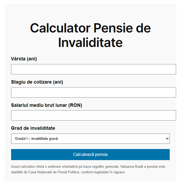 Calculatorul a fost realizat să fie ușor de folosit. Doar introduceți vârsta actuala, anii de muncă, salariul mediu brut lunar la ora curenta și gradul de invaliditate. După asta, va fi generată o pensia la care aveți dreptul sau ce pensie vă poate oferi statul, bazat pe anii de munca. Indiferent că aveți 10 ani de munca, sau 40, calculatorul ia în considerare toate valorile.